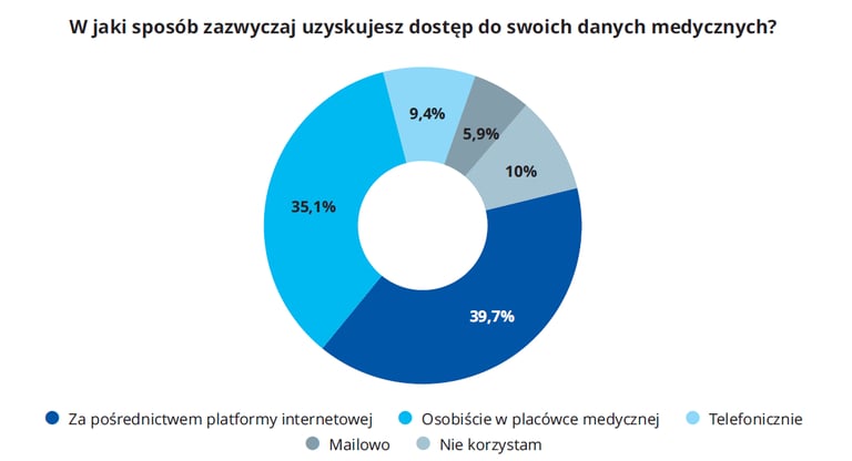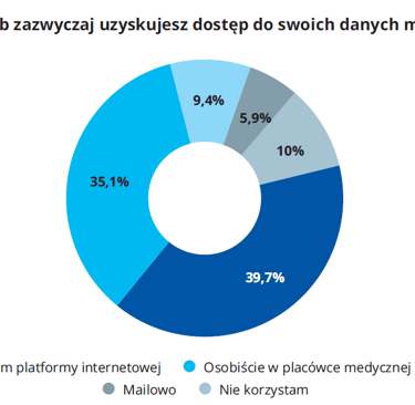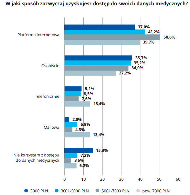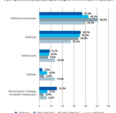 Platformy internetowe są najpopularniejszym źródłem danych, najczęściej wybieranym przez wszystkie grupy respondentów, niezależnie od stopnia ich zamożności, jednakże korzystanie z innych form dostępu do danych istotnie zmienia się wraz z dochodem osób ankietowanych. Polacy o niższych dochodach częściej nie korzystają z dostępu do danych medycznych lub robią to osobiście poprzez udanie się do placówki. Osoby o najwyższych dochodach poza platformami internetowymi częściej do komunikacji z placówką medyczną wykorzystują mail lub telefon.