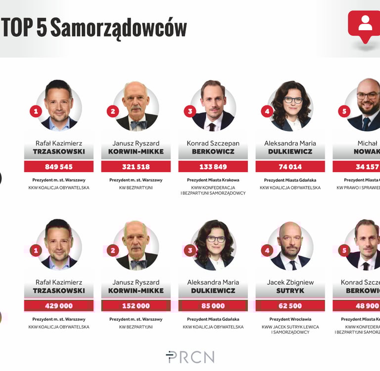 W dzisiejszych czasach media społecznościowe odgrywają znaczącą rolę w komunikacji politycznej, umożliwiając politykom bezpośrednią interakcję z wyborcami. W najnowszym raporcie firmy doradczej PRCN sprawdzono, którzy z kandydatów na prezydentów miast wojewódzkich najlepiej radzą sobie na Instagramie oraz na platformie X (dawniej Twitter). Raport pokazuje, jak politycy wykorzystują platformy społecznościowe do promowania swoich idei, budowania wizerunku oraz angażowania się w dialog z obywatelami. Na jego podstawie wskazano top influencerów spośród kandydatów na prezydentów miast.