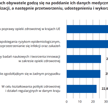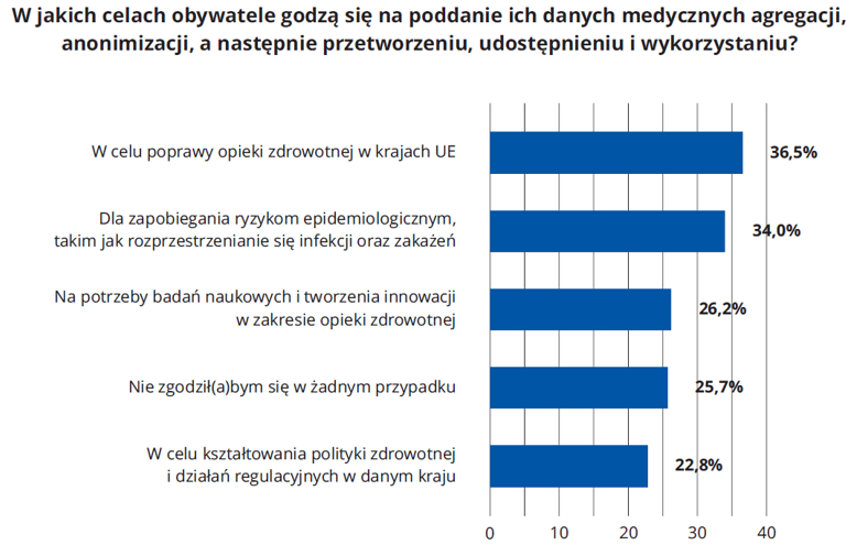 Polacy chętnie przekażą dane zdrowotne, by usprawnić funkcjonowanie systemu ochrony zdrowia, nie chcą się jednak nimi dzielić na cele naukowe. Dla Polaków największą korzyścią z udostępniania danych medycznych podmiotom trzecim, jest poprawa systemów opieki zdrowotnej– 36,5% głosów respondentów, ważne jest dla nich także: zapobieganie ryzykom epidemiologicznym oraz rozprzestrzenianiu się infekcji i zakażeń – 34%. Znacznie mniej badanych godzi się z przekazywaniem populacyjnych danych medycznych na cele naukowe – 26,2%. Stanowczo bardziej nieufne są osoby powyżej 50 roku życia, kobiety i osoby najniższym wykształceniem.