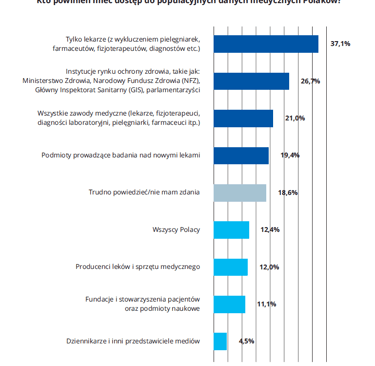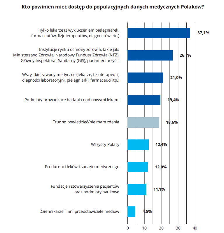 Zgodnie z wynikami raportu, 37,1% respondentów uważa, że wyłączny dostęp do danych medycznych powinni mieć lekarze. Zaledwie 21% akceptuje dostęp dla innych zawodów medycznych – takich jak pielęgniarki, diagności czy farmaceuci. Tylko co czwarty obywatel zgadza się na udostępnianie danych instytucjom publicznym. Najniższy poziom zaufania dotyczy dziennikarzy – zaledwie 4,5% respondentów dopuszcza ich szeroki dostęp do populacyjnych danych medycznych.