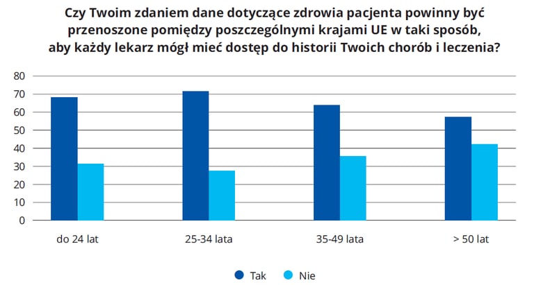 Przenoszenie danych pomiędzy krajami wymaga jednak otwartości danego społeczeństwa na udostępnianie populacyjnych danych medycznych – zarówno do celów badawczych, informacyjnych oraz dla efektywnego kształtowania systemów opieki zdrowotnej. Dane wskazują, że młodsze osoby chętniej wyrażają zgodę w stosunku do przekazywania danych zdrowotnych wśród wspólnoty państw UE. Wraz z wyższym wiekiem – rosną obawy z tym związane. Największe poparcie dla przenoszenia danych jest w grupie 25-34 lata – 72%. Osoby poniżej 24. roku życia również w większości popierają takie rozwiązanie – 68,4% badanych. Najmniejsze poparcie wyrażają seniorzy powyżej 50 lat – zaledwie 57,5%.